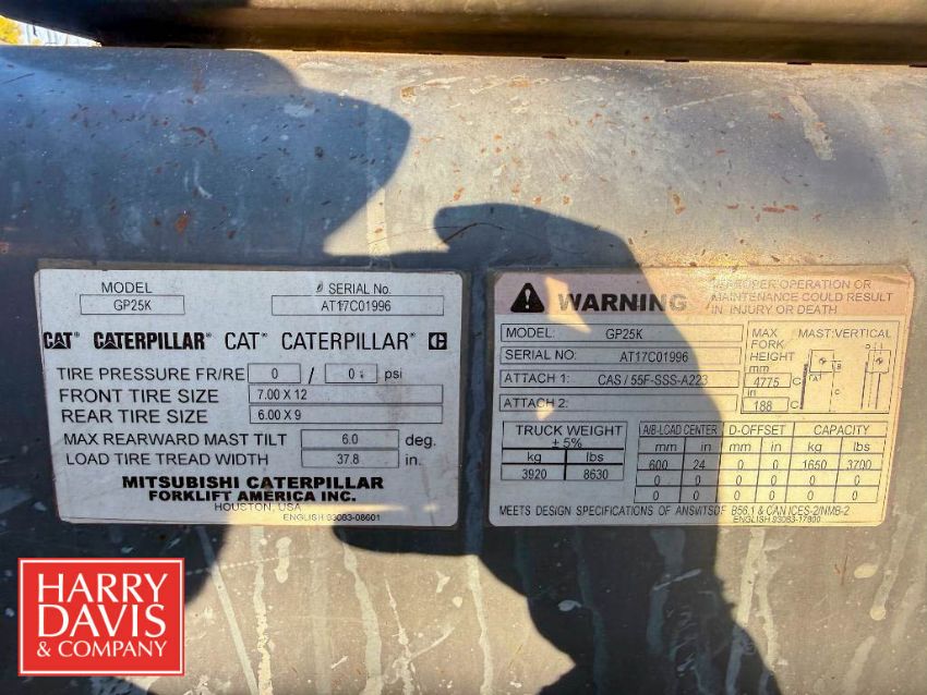 Cat 3,700 LB Capacity Propane Fork Truck, Model: GP25K, S/N: AT17C01996 (Location: Visalia, CA) - Rigging Fee: $500
