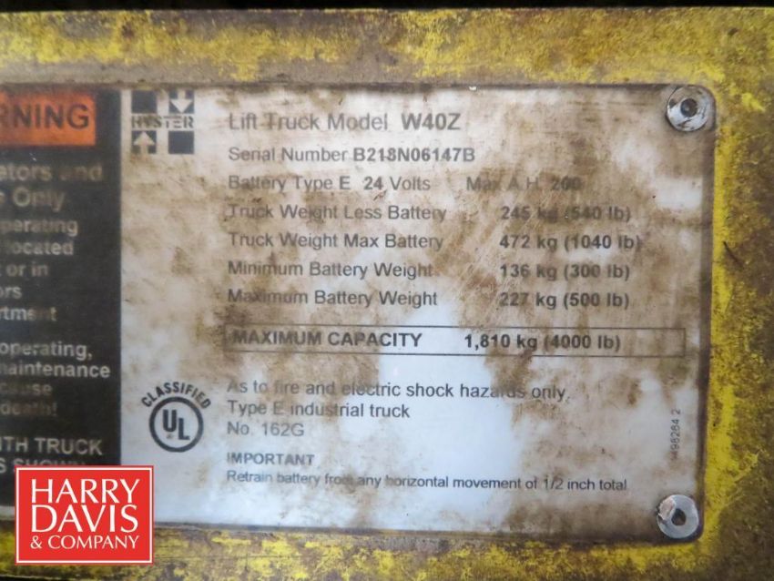 Hyster 4,000 LB Capacity Electric Pallet Lift, Model: W40Z, 24 Volts
