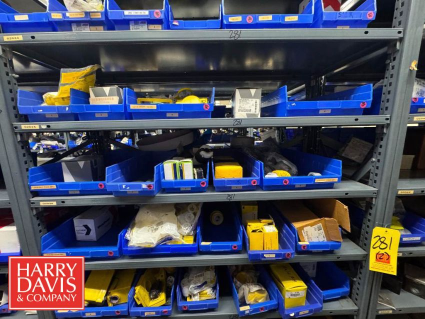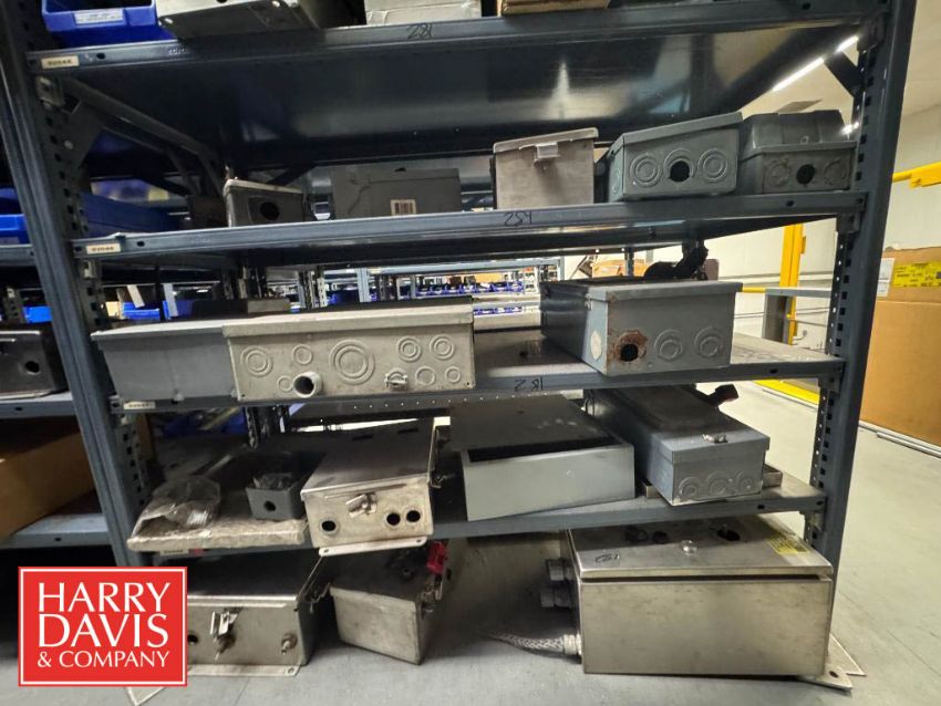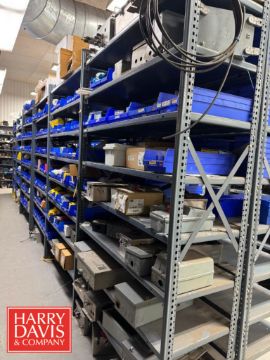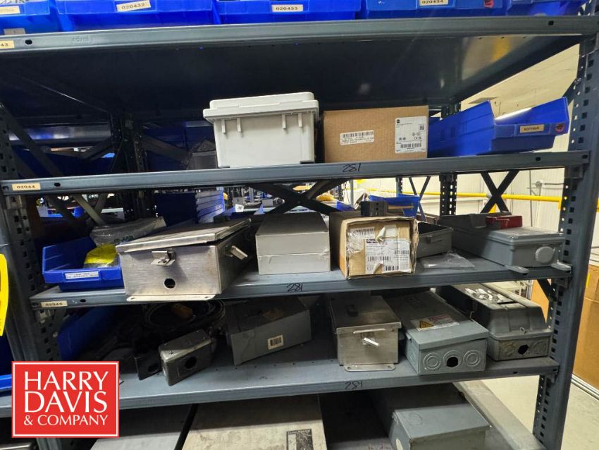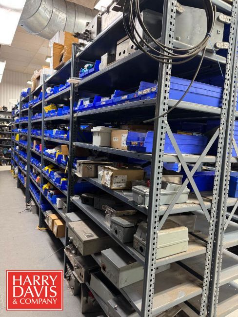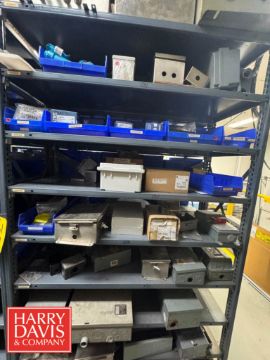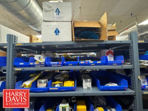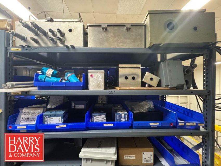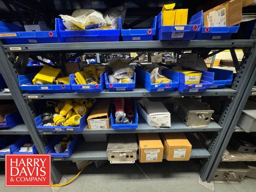 Racks with Assorted Parts, Including: Plugs and Connectors, Electrical Receptacle, Watertight Plugs, Electrical Plugs, Closure Plugs, Cord Grip Aluminum Fittings, Watertight Outlet Box, S/S Control Panels, Connectors and Inlet Plugs