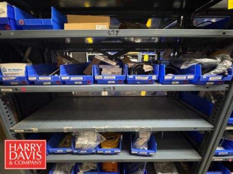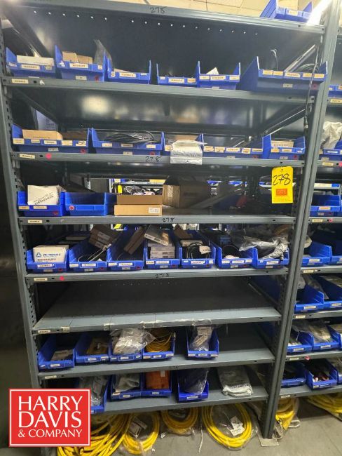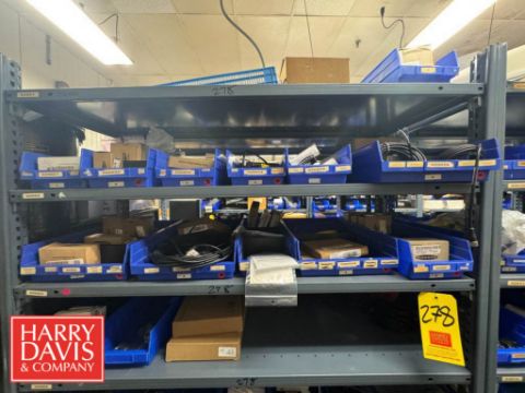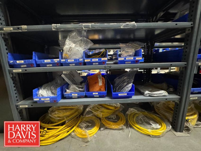 Rack with Assorted Parts, Including: Cables, Fiber Optic Light Guide, Fiber Optic Cable, Photo Switch, Fiber Optic Blocks, Proximity Switches, Sensors and Reflex Photo Electric