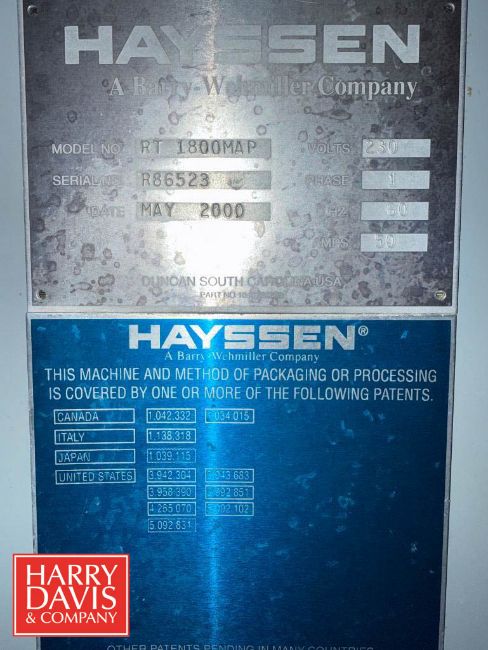 Hayssen Horizontal Form and Seal Cheese Packaging Machine: 134” Length, Model: RT1800 MAP, S/N: R86325 with Indexing Conveyor: 72"