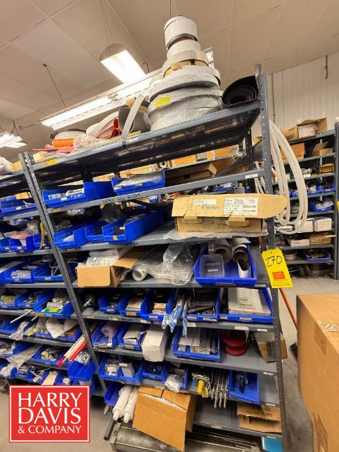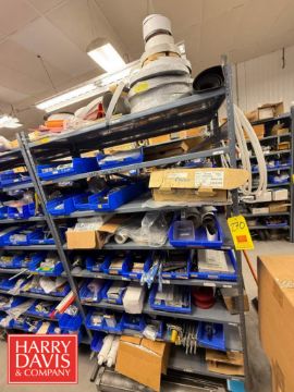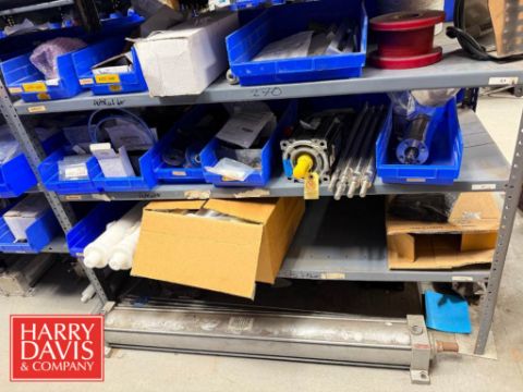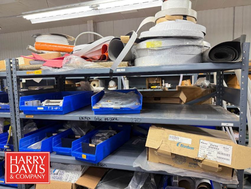 Rack with Assorted Parts, Including: Nordson Glue Machine Parts, Auto Harp Parts, Gas Mixers, Bushings, Bulk Head Fittings, Filters, Lubricant, Blue Nordson Hose, Ball Nuts, Couplings, Cutters, Clamps, Switches, Gauges, Connectors, Actuators, Servo Drive Kinetics Motor, Repair Kits and Rollers