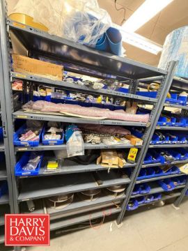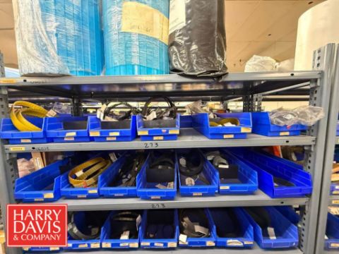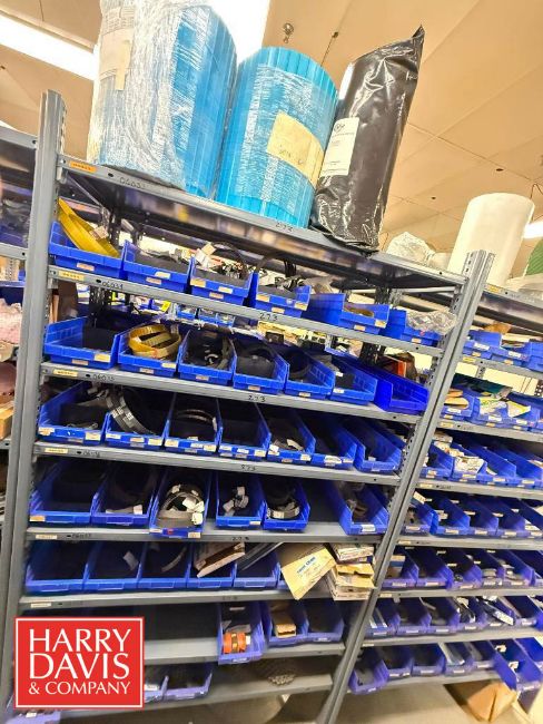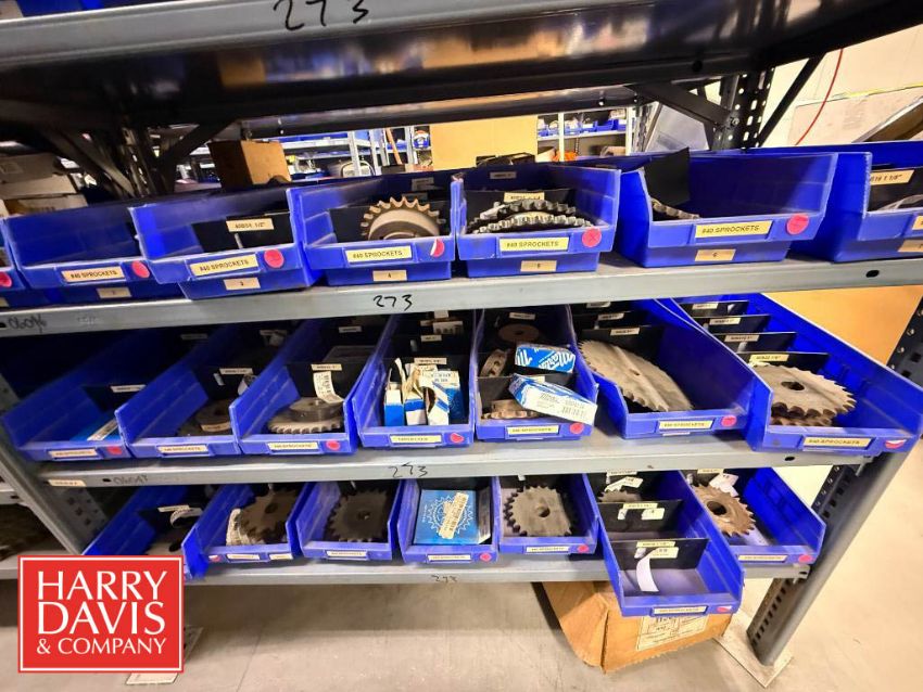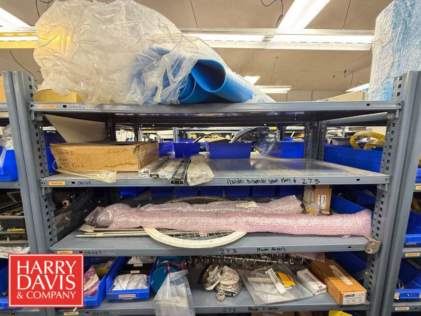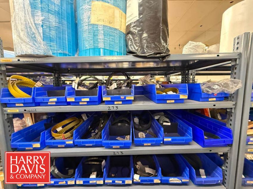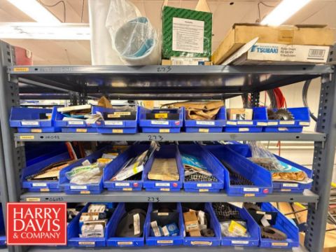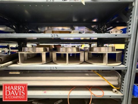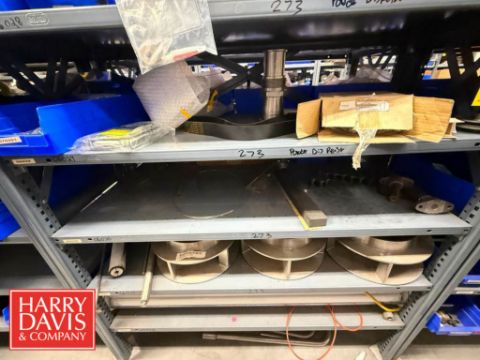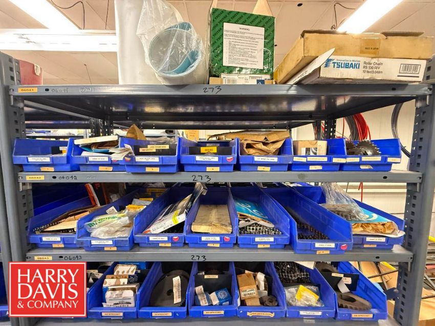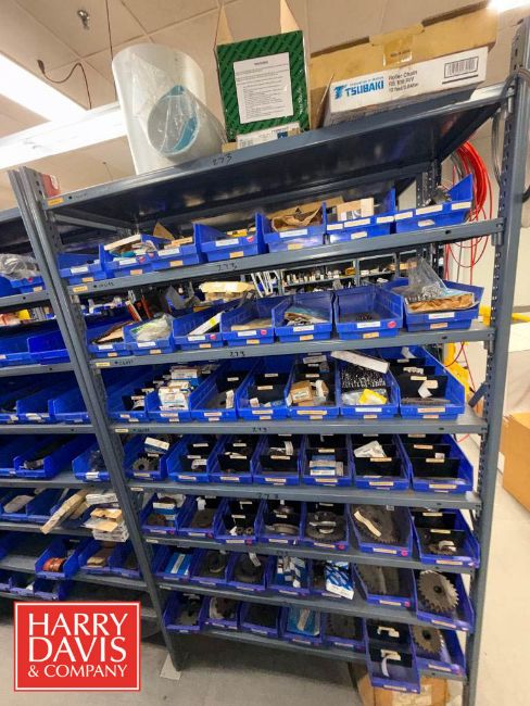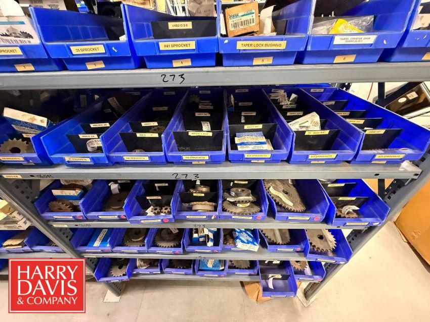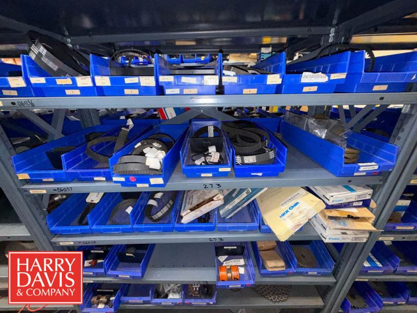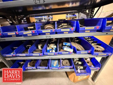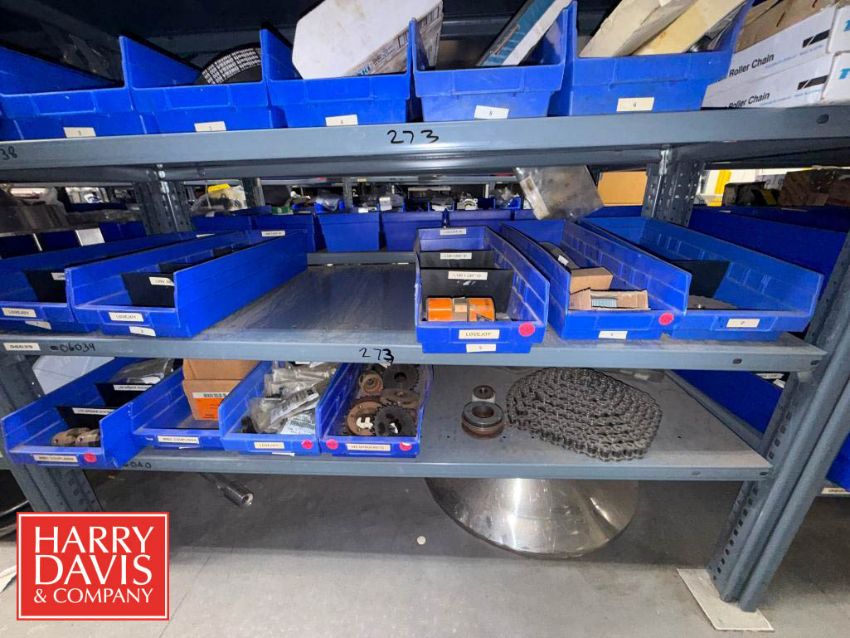 Racks with Assorted Parts, Including: Screw Augers, Drive Sprockets, Gearbox, Sifting Screen, Dancer Shaft, Rotary Ball Vibrators, Sheaves, Pulley Belt, Impeller, Assorted Belts, Spider Couplings, Sprockets, Chain and Links and Bushings