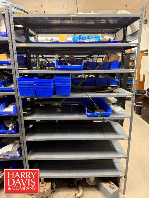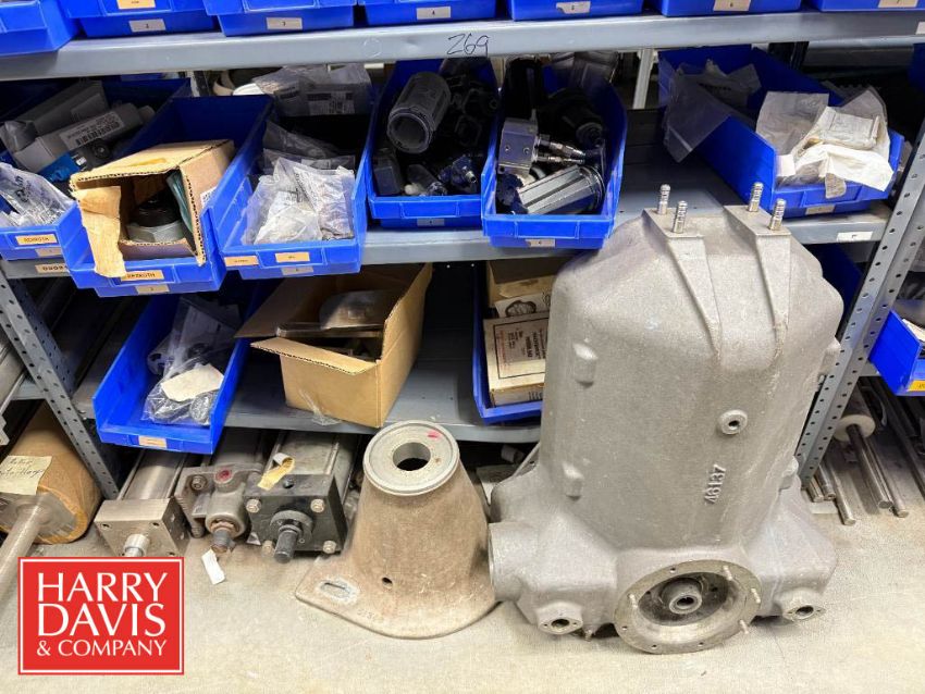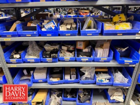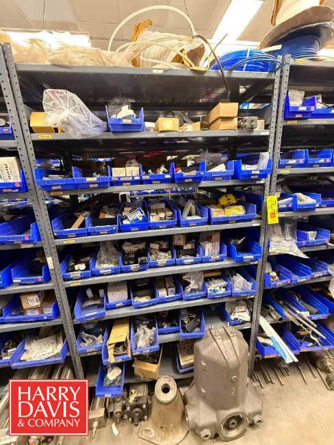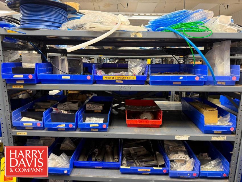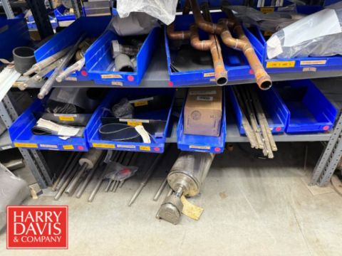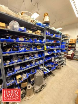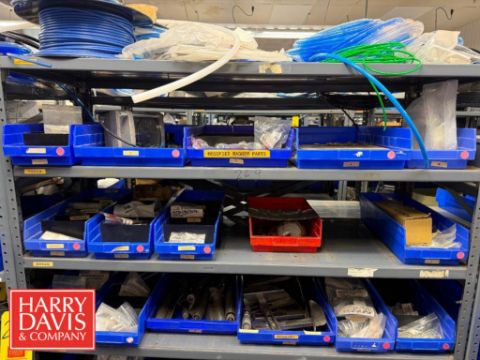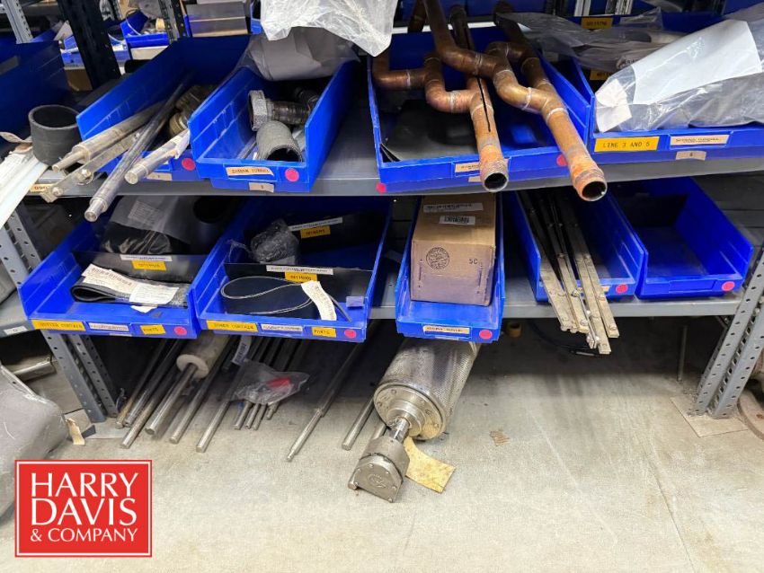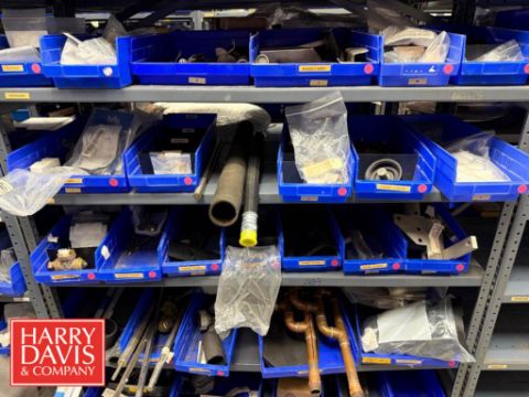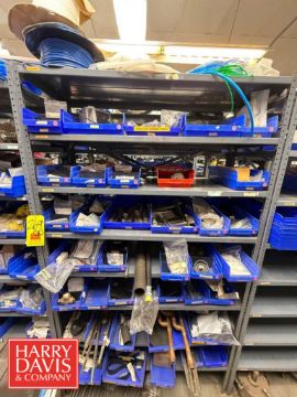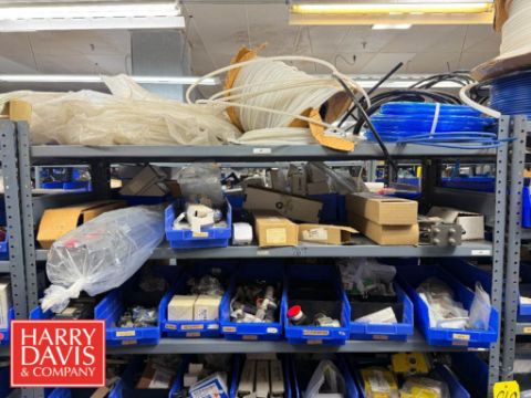 Racks with Assorted Parts, Including: Pneumatic Valves, Air Switches, Water Regulators, Gauges, Connectors, Bushings, Seal Repair Kits, Collars, Flow Mufflers, Toggle Clamps, Springs, Adapters, Copper Piping, Straight Curtains, Copper Ball Filter and Pneumatic Hose