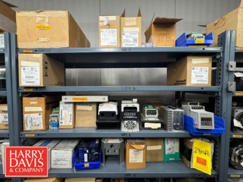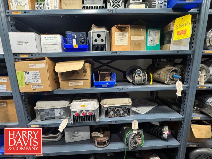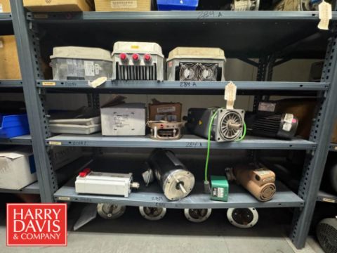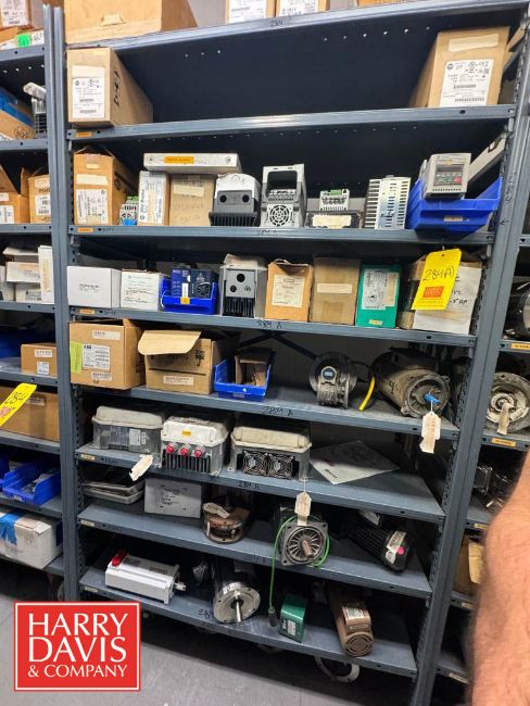 Rack with Assorted Parts, Including: (4) Allen-Bradley 1-2 HP Power Flex 525 Variable-Frequency Drives, Allen-Bradley Circuits, VSSP 500 AC Drives, Gear Motors, Sterling 2 HP S/S Motor and Taco High Capacity Circulator