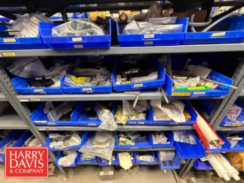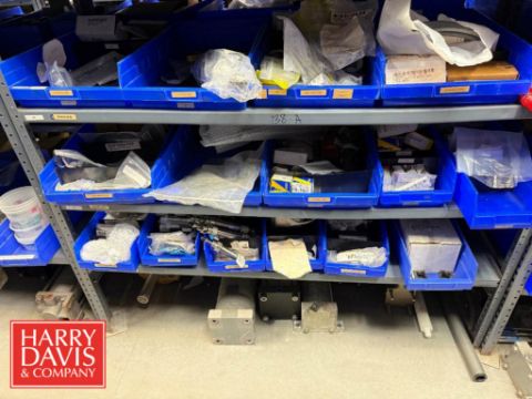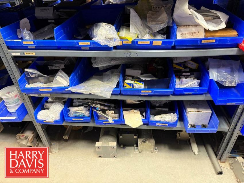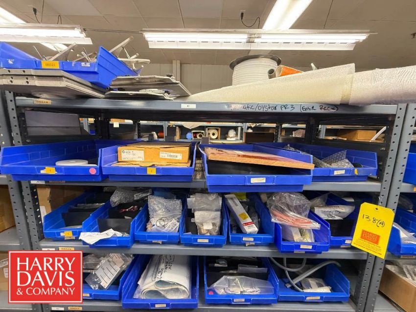 Rack of Assorted Hayssen Parts, Including: Allen-Bradley Cables, Panels, Bushings, Gauges, Air Pilot Valve, Shock Absorber, Heat Seal Gaskets, Bearings, Filter/Regulator, Cylinders, V-Rings, Belts, Switches, Solenoids, Connectors, Electrical Contactors, O-Rings, Spacers and Regulators