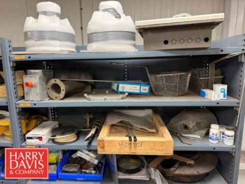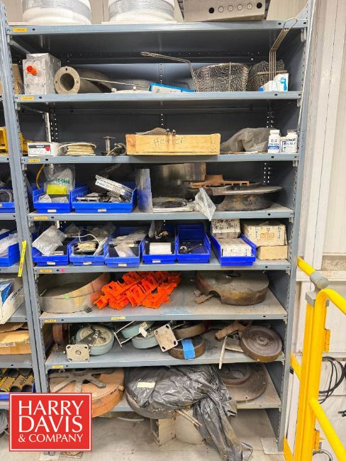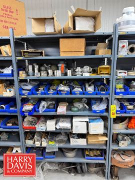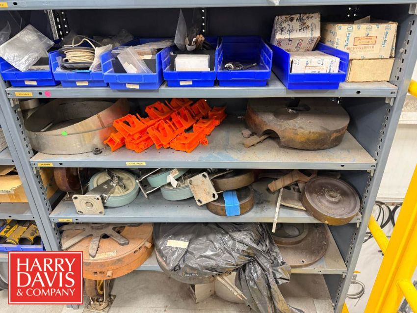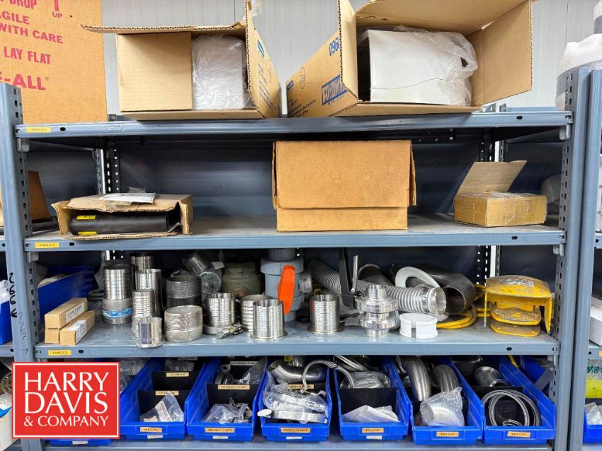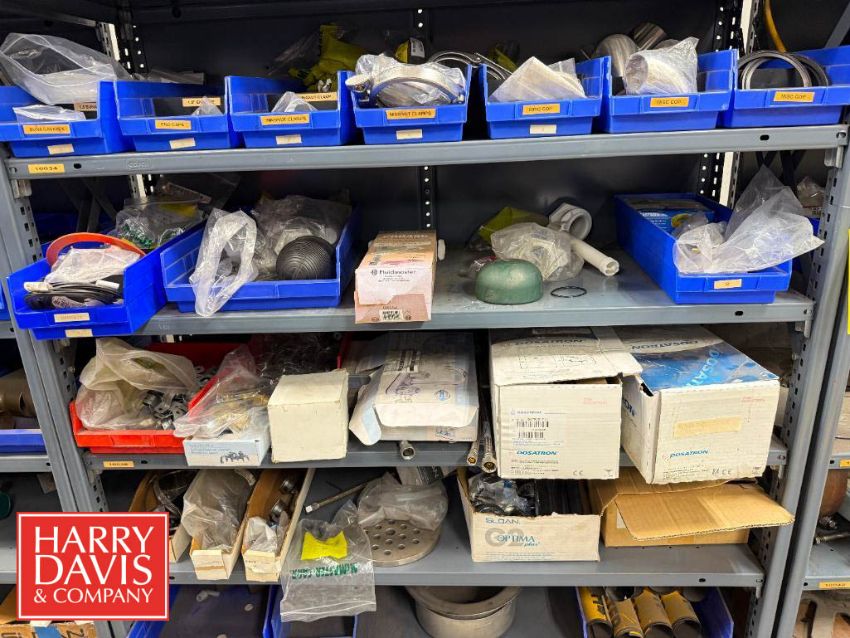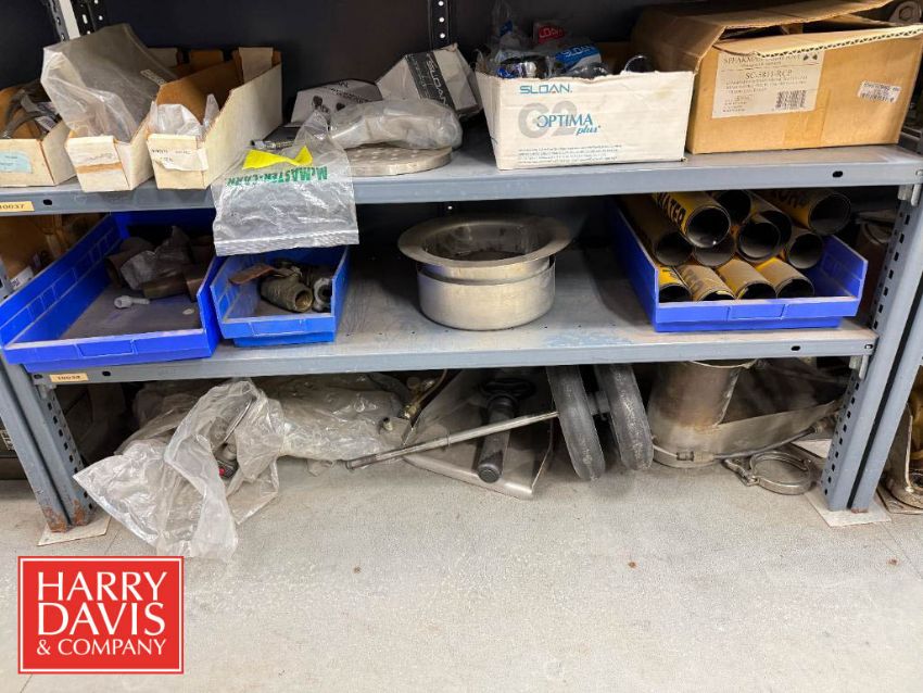 Racks with Assorted Parts, Including: Gaskets, End Caps, Wing Nut Clamps, Casters, Flanged Outlets, Dosatron Dosing Pumps, Ball Valves, Nut Caps, Bushings, Connectors, Switches and Chains