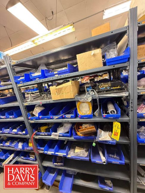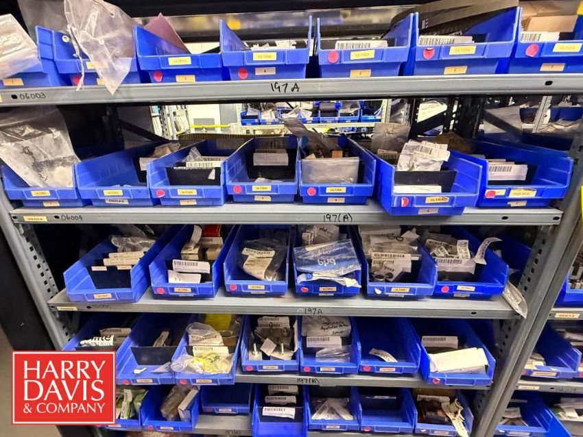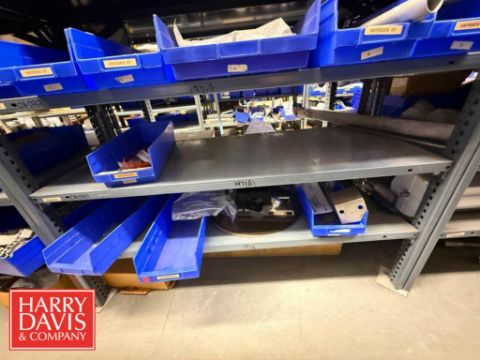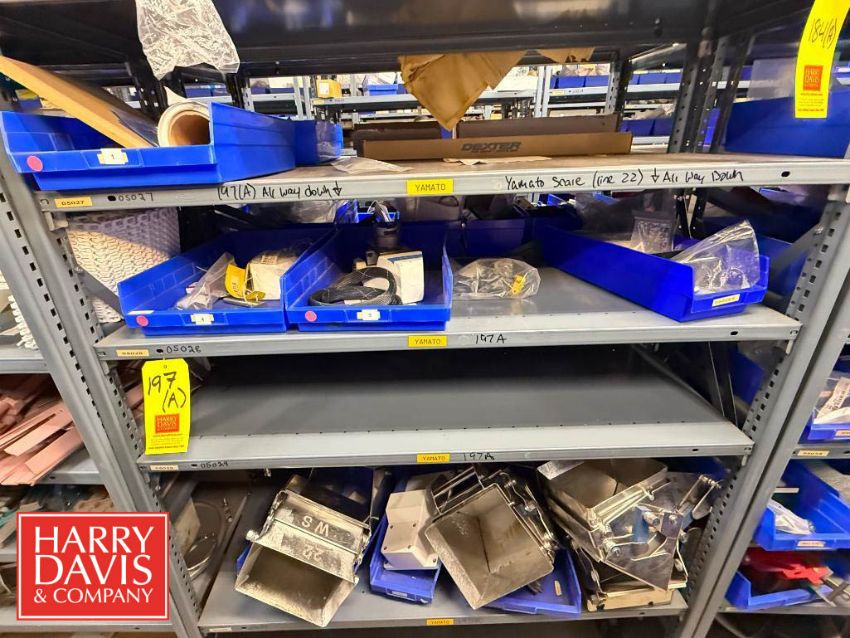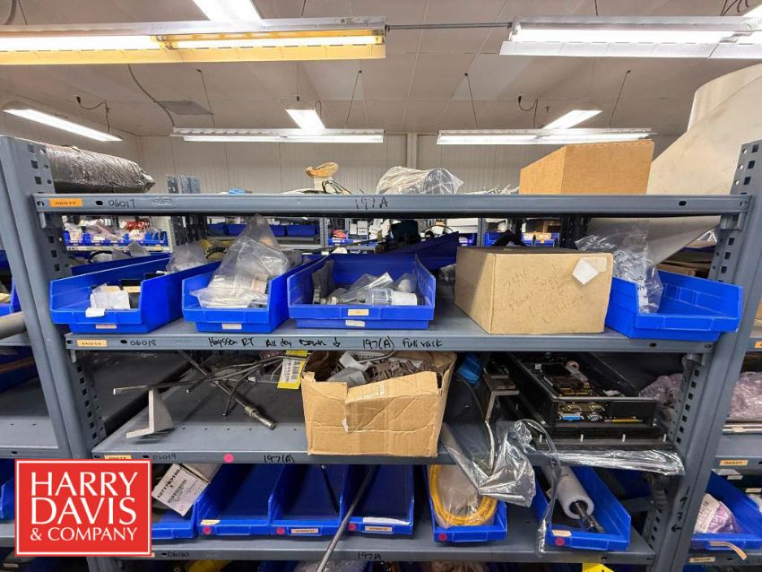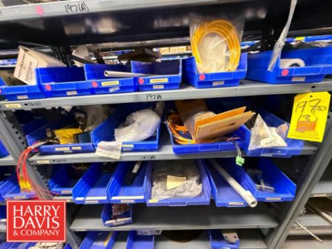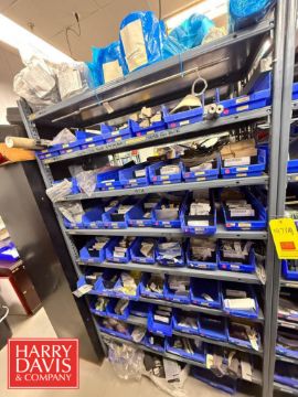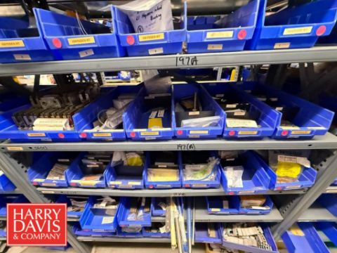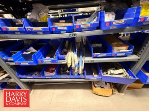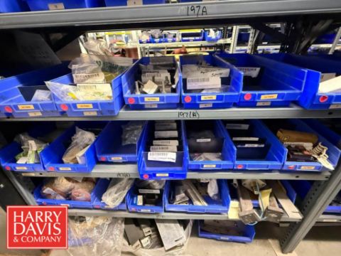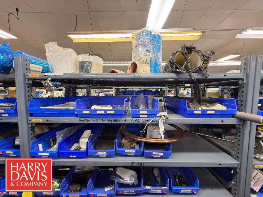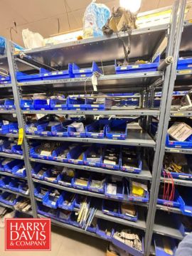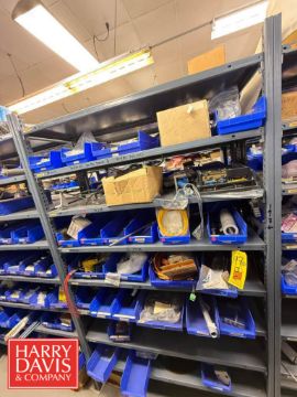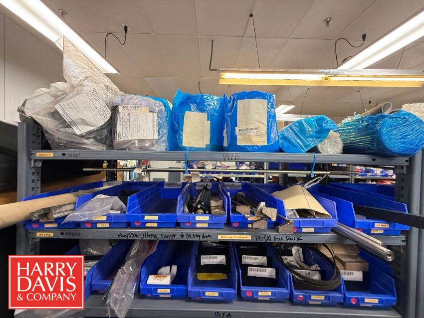 Racks with Hayssen Bagger Parts, Including: Weigh Holders, O-Rings, Motor Cover Housings, S/S Buckets, Cable, Plugs, Conveyor Shaft, Tapered Roller, Safety Relay, Guide Rods, CTC Touch Screen HMI, Power Supply, Cylinders, Bearings, Bushings, Copper Fittings, Tie Plates, Die Borings, Nuts, Gears, Washers, Retainers, Block Clamps, Jaw Clamps, Rover Spacers, Regulator, Breakers and Cable Kit