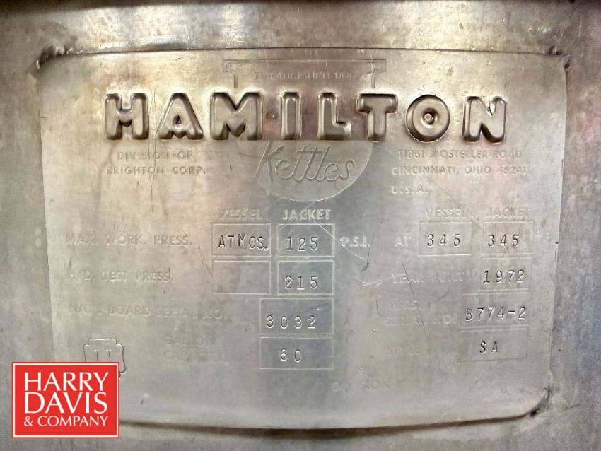 Hamilton 60 Gallon S/S Kettle, S/N: B774-2 with Paddles and Side Scrape Agitation (Pump not included)