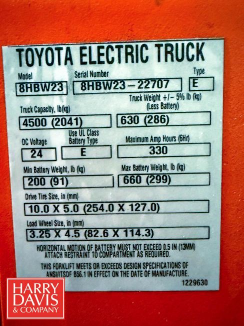 Toyota 4,500 LB Capacity Electric Pallet Jack, Model: 8HBW23, S/N: 8HBW23-22787