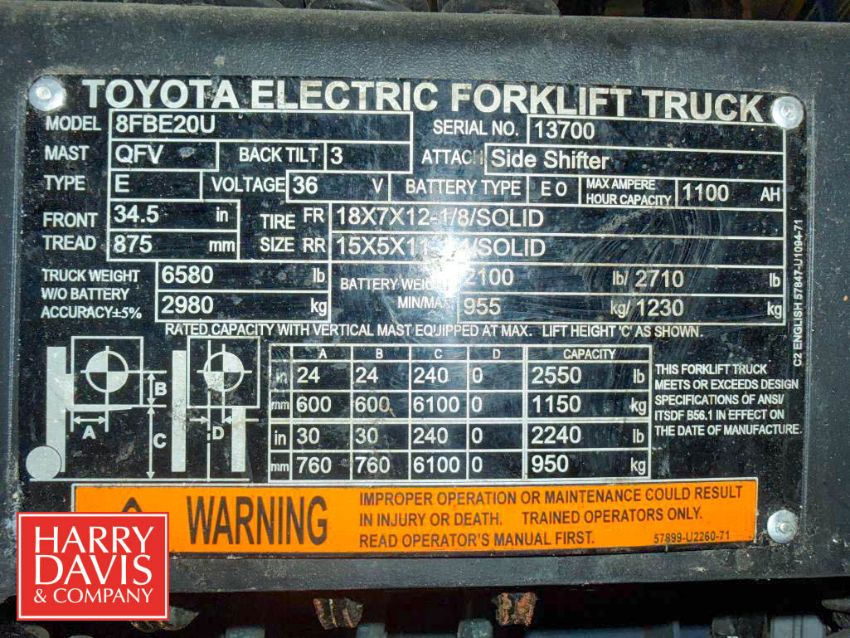 Toyota 2,550 LB Capacity Electric Fork Truck, Model: 8FBE20U, S/N: 13700