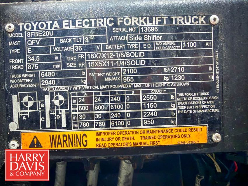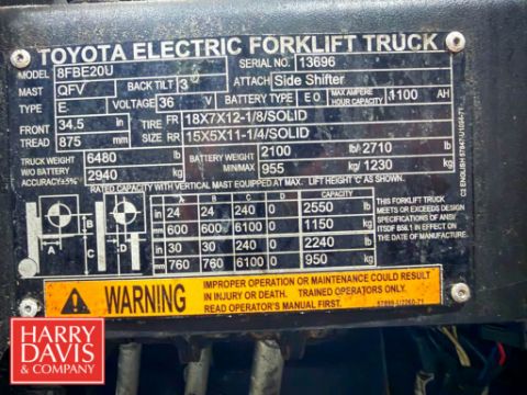 Toyota 2,500 LB Capacity Electric Fork Truck, Model: 8FBE20U, S/N: 13696