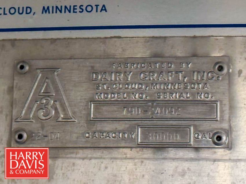 Dairy Craft 30,000 Gallon Silo, S/N: 79D-24092 with Horizontal Agitation , Inlet/Outlet Valves and Level Sensor