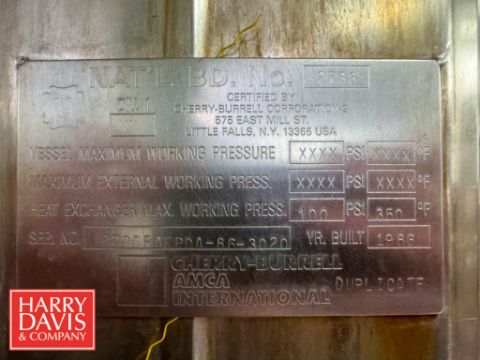 Cherry Burrell 2,000 Gallon Jacketed S/S Blend Tank, S/N: 2000 PAE PDA 863020 with Vertical Agitation