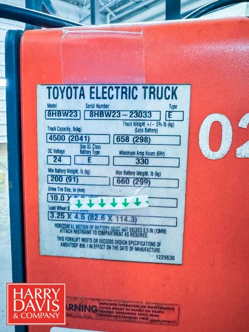 Toyota 4,500 LB Capacity Electric Pallet Jack, Model: 8HBW23, S/N: 8HBW23-23033