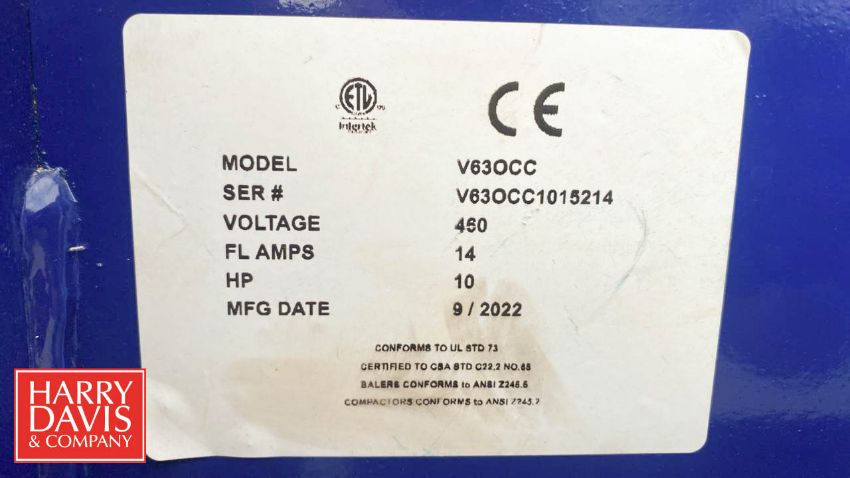 2022 REI Cardboard Baler: 47" x 77" x148", Model: V630CC with 10 HP Motor, Hydraulic Power Unit and Operator Safety Controls, S/N: V63OCC1015214