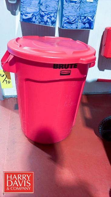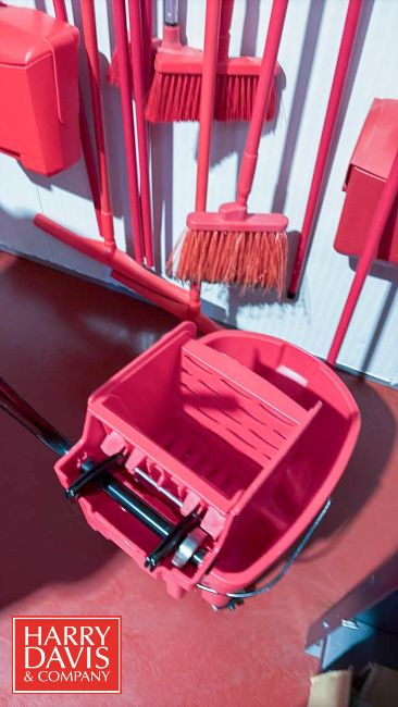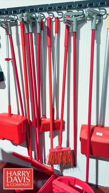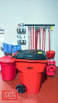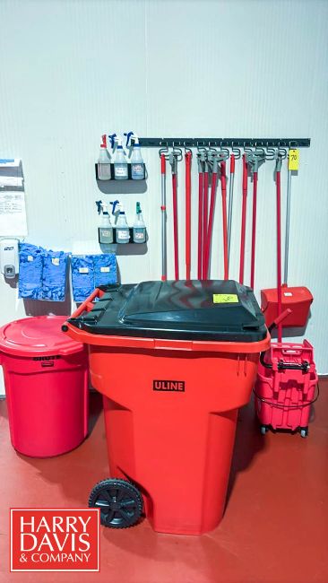 Uline 64 Gallon Trash Bin with Lid, Rubbermaid Brute 32 Gallon Trash Can with Lid, Commercial Mop Wringer Bucket, (4) Brooms, (5) Mop Handles, (2) Dustpans, Cleaning Sprayers and Wall-Mounted Rack