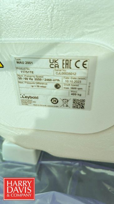 2023 Leybold Roots Vacuum Pump, Model: WAU 2001, S/N: CJL00035012 with 3,600 RPM Motor
