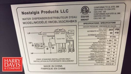 2020 Igloo Bottom Load Water Dispenser, Model: YL1237S , S/N: MA20F28044 with Nostalgia Hot/Cold Water Dispenser , Model: IWCBL353CRHBKS