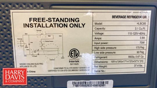 Hailang Mini Fridge: 15.9" x 17.3" x 32.8", Model: HLBC85, S/N: 710015006203240803901