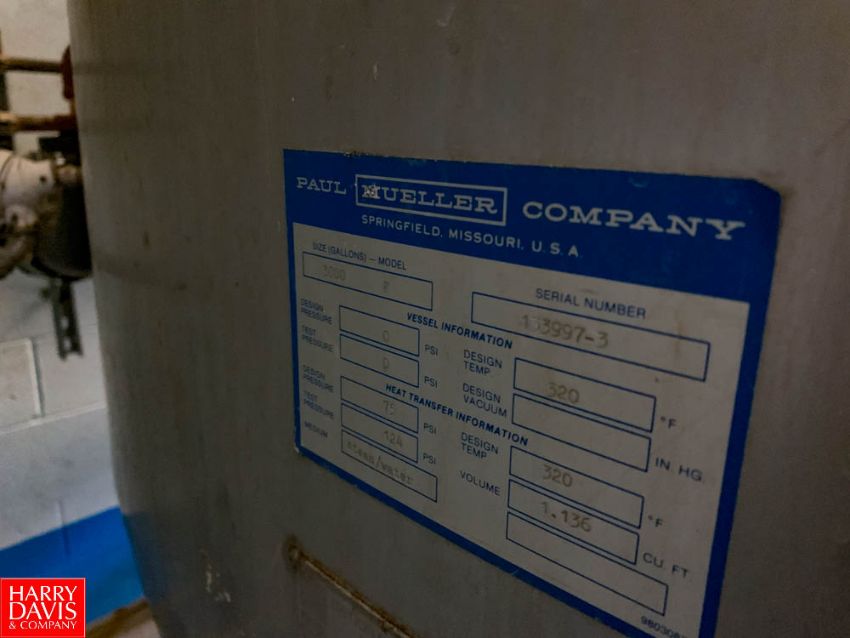 Mueller 3,000 Gallon S/S Dome-Top Cone-Bottom Jacketed Blend Tank, S/N: 133997-3 with Vertical Agitator, S/S Baffles and Spray Ball Rigging Fee:$4000