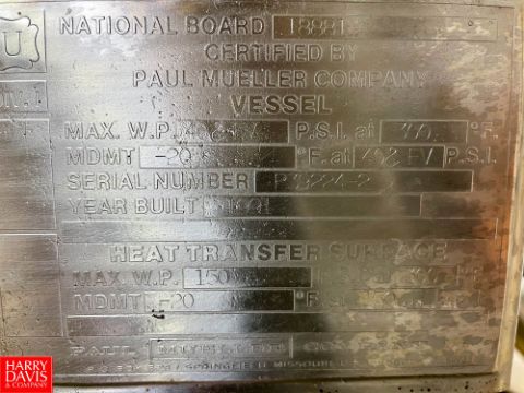 Mueller 50 Gallon Vacuum Jacketed Dome-Top Dish-Bottom S/S Tank, Mounted on S/S Skid