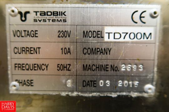 2015 Tadbik Top & Bottom Labeler Model: TD700M S/N: 2693, with 7" Touch Screen Controller, Model ST300-MD Motor Controller, 230V, 10A, 50 Hz, 3PH. Rigging Fee: Includes Skidding $650.00