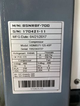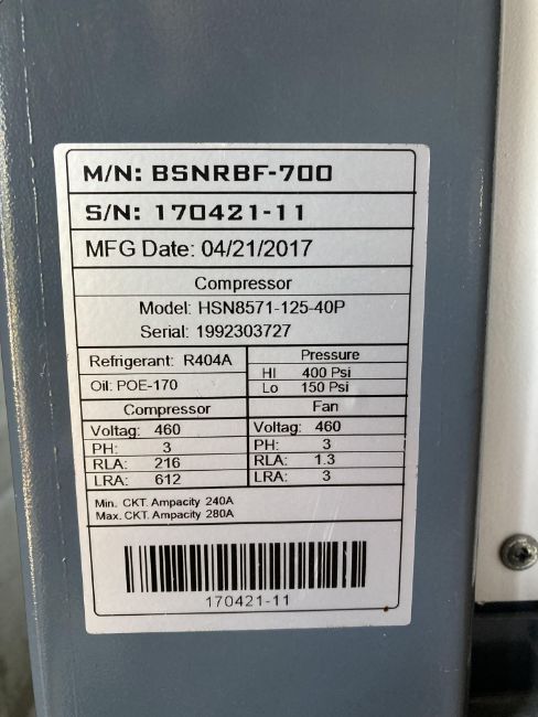 NEW NEVER INSTALLED Blast Freezer Condensing Unit with Bitzer Scroll 4-Stage 125 HP Freon Compressor and Controls, 56.6 Ton Capacity. Rigging Fee: $2500*** Subject to Confirmation***