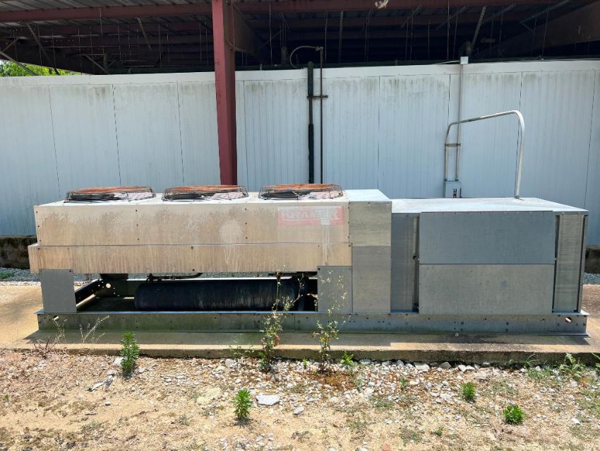 Interlocking Panel Cooler System with (82) 12' x 44.5" Panels, Roof, (8) Kramer 3-Fan, Medium Temp, R-22 Freon Evaporators, Model: CSA-620-F, (2) Kramer Evaporative Condensers, (2) 100" x 8' Insulated Sliding Doors and 7' x 3' Insulated Door and (6) Light Housings - Rigging Fee: Contact HDC