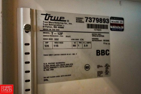 TRUE One Section Reach In Freezer 23'' x 24'' x 66 Tall, Right Hand Hinge, 115 Volt, 60 Hz, 2.6 Amp, Single Phase, Model: T-12F , S/N: 7379893 - Rigging Fee: $200