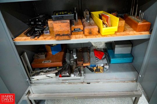 Contents of Tool Storage Crib 1 (3) 2 Door Metal Cabinet Filled with Lathe Tooling Bars, Collets, Drills, Mills, Micrometers, Indicators, Roughness Scales, Level, Thread Wires, Trammel Points and Bars, 24'' Vernier Calipers, Outside Calipers, Gasket Punches, Retaining Rings and Pliers, 4 Metro Racks with Contents, Rolling Carts, Digital Scale - Rigging Fee: $TBD