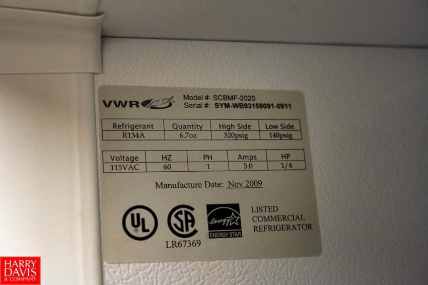 VWR Laboratory Freezer 28'' x 32'' x 71'' Tall, Temperature Range: -20C Degree (-4F), No. of Shelves 4, Defrost Manual, Volume 481 L (17 cu. Ft), 115 V, 60 Hz, 5.0 Amps, (2009), Model: SCNMF-2020 , S/N: SYMWB93158091-0911 - Rigging Fee: $150.00