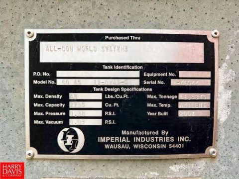 Imperial Industries Resin Tank, Model: 60 45 12-0X42-0, S/N: I-46944, Maximum Tonnage = 61.5375 - Rigging Fee: $8,000