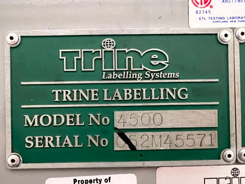 Trine Labeling Systems Labeler, Model: 4500, S/N: 052M45571 with Parker Touch Screen HMI Mitsubishi Melsec FX2N-48Mt PLC with (4) I/O Cards, Mitsubishi E500 3 HP Variable-Frequency Drive, Power Supply, Transformers, Contactors, Switches and Keyboard - Rigging Fee: $2,000