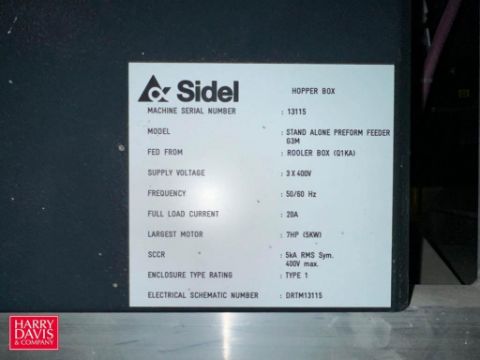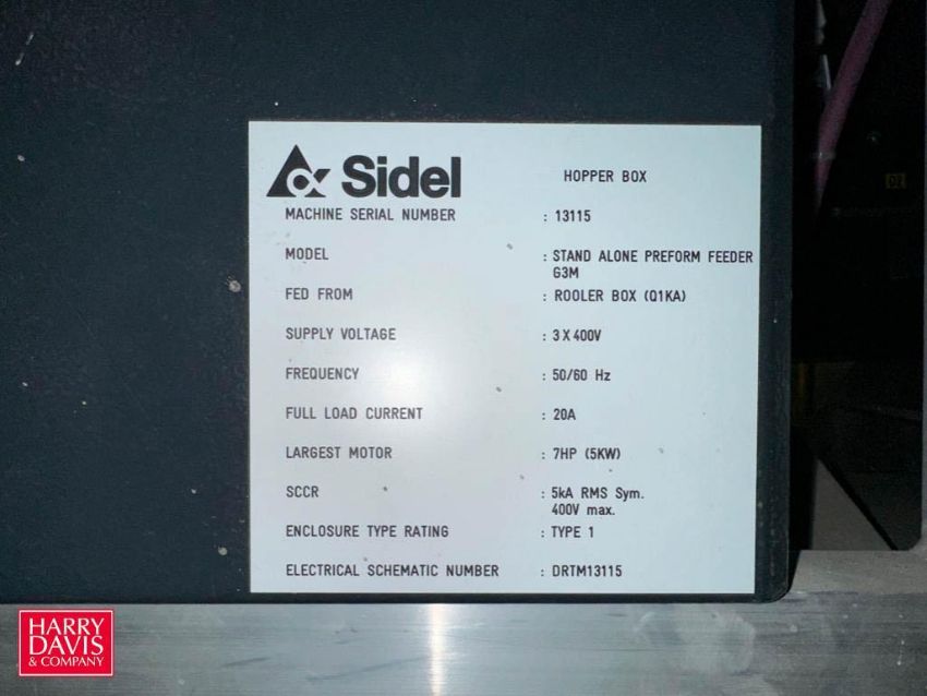 Sidel Hopper Box, Model: Stand Alone Preform Feeder 63M, S/N: 13115 with Elevator: 20' x 10", Danfoss VLT Variable-Frequency Drives, Siemens DP/DP Coupler and Contractors - Rigging Fee: $500