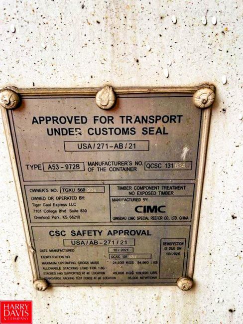 2021 Insulated, 53' CIMC Container with Carrier Vector HE19 Refrigeration Unit, Approximately 1,121 Reefer Hours, 102 Gallon Diesel Tank, 480 Volt/30 Amp, VIN: HD236261 (Location: Chicago, IL) - Rigging Fee: TBD