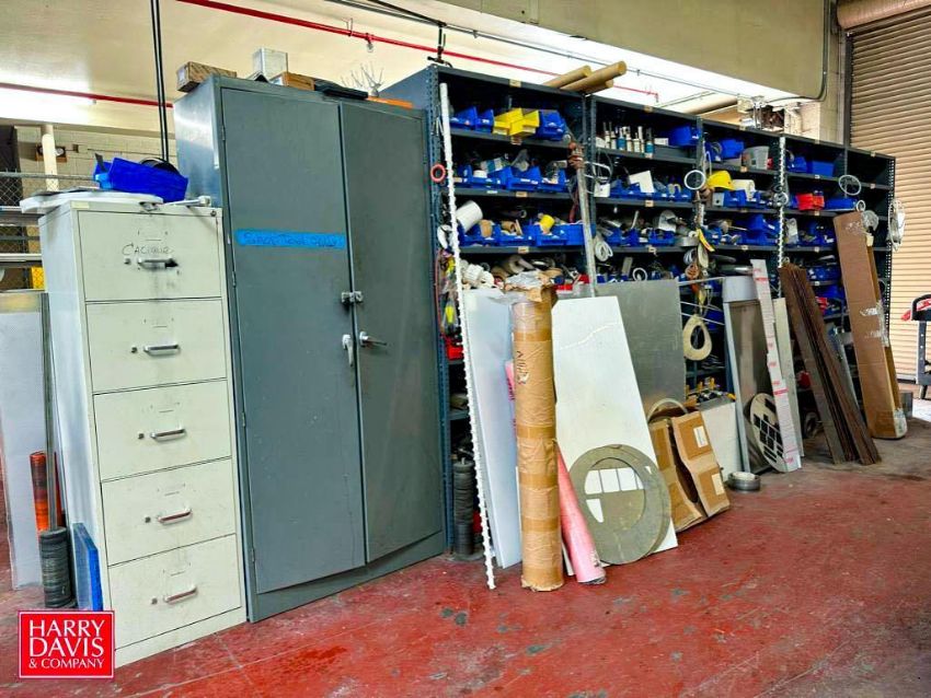 Shelves: 85" x 3’ x 2’, Cabinet, Filing Cabinet with Contents, Including: S/S Fittings, Conveyer Sprockets, Valve Manifold, Motor Parts, Tubing and Drill Bits - Rigging Fee: $700