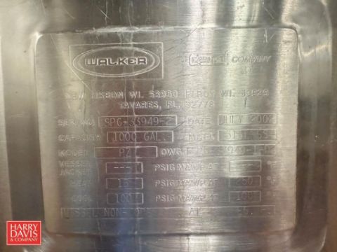 Walker 1,000 Gallon Dome-Top Jacketed 316L S/S Processor, Model: PZ, S/N: SPG-33949-2 with Vertical Wide Sweep Agitation and Adjustable Baffle - Rigging Fee: $1,950