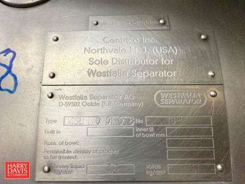 Westfalia Cream Separator, Model: MSD170-01-06, S/N: 1716553 with S/S Control Panel (Subject to Confirmation) - Rigging Fee: $4,500