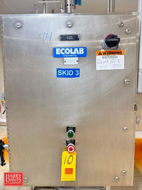 Ecolab 2-Tank Skid-Mounted CIP System, Including: Alfa Laval 10 HP 3,520 RPM Motor, Centrifugal Supply Pump, Shell & Tube Heat Exchanger, Routing Valves, Piping and Control Panels - Rigging Fee: $2,000