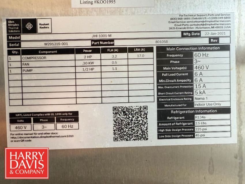 2021 Dimplex Thermal Solutions Kodlant Koolers, Model: JHI-1001-M, S/N: W295319-001 - Rigging Fee: $1,000