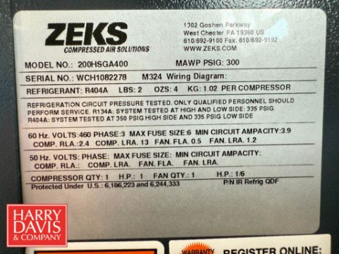 Zeks Heatsink Cycling Refrigerated Air Dryer, Model: 200HSGA400, S/N: WCH1082278 - Rigging Fee: $250