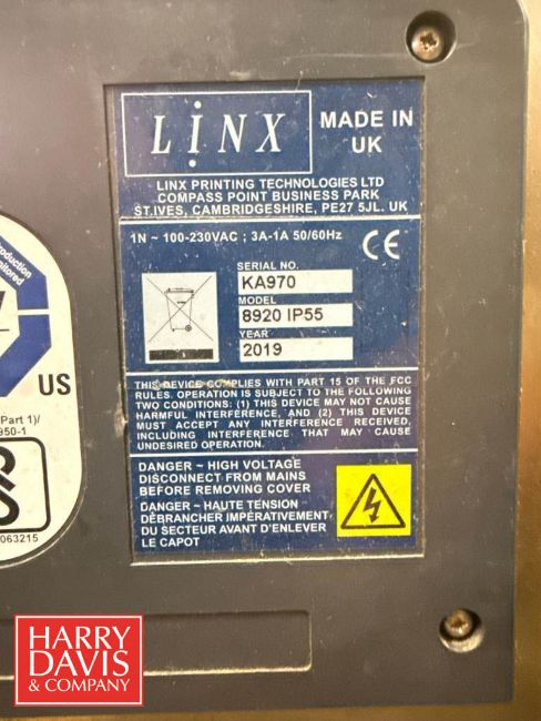 2019 Linx Inkjet Printer, Model: 8920IP55, S/N: KA970 - Rigging Fee: $200