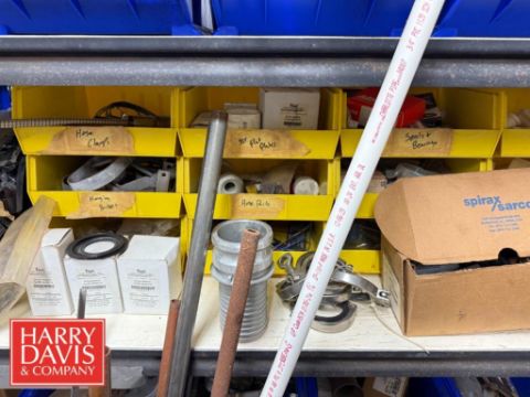 Shelf with Contents, Including: Conveyor Parts, Gaskets, Poly Flow Tubing, Clamps, Seals, Bearings, Tubing Hangers, Valves, Motors and Utility Pump - Rigging Fee: $125