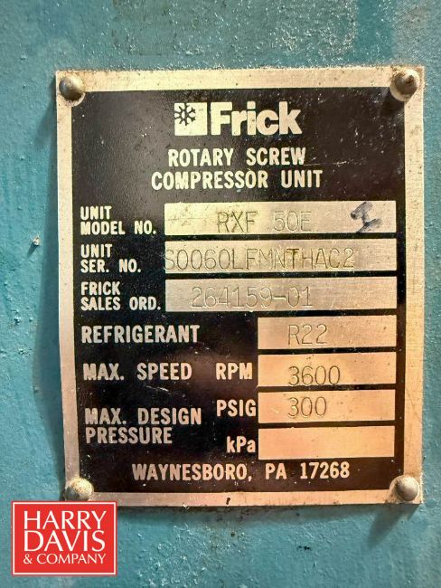 Frick Rotary Screw Compressor, Model: RXF50E, S/N: S0060LFMNTHAC2 with 3,600 RPM Motor (Location: Bellmawr, NJ) - Rigging Fee: $1,500