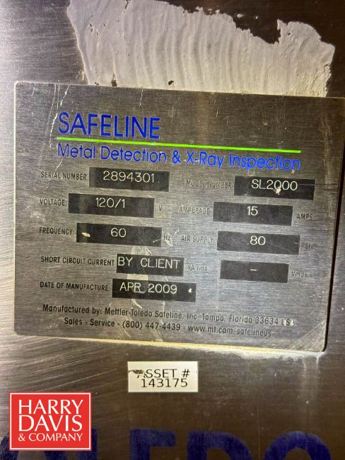 Mettler Toledo Safeline Metal Detector/X-Ray Machine, Model: SL2000, S/N: 2894301 with Aperture 3” x 19.5”: Mounted on S/S Cart with Conveyor: 116” x 18” (Location: Woburn, MA) - Rigging Fee: $225