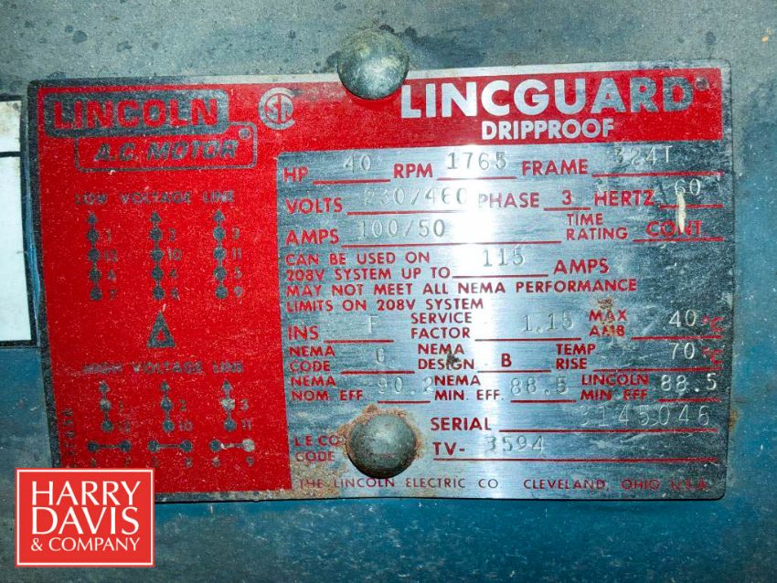 Lincoln 40 HP 1,765 RPM Motor (Location: Port Edwards, WI) - Rigging Fee: $150